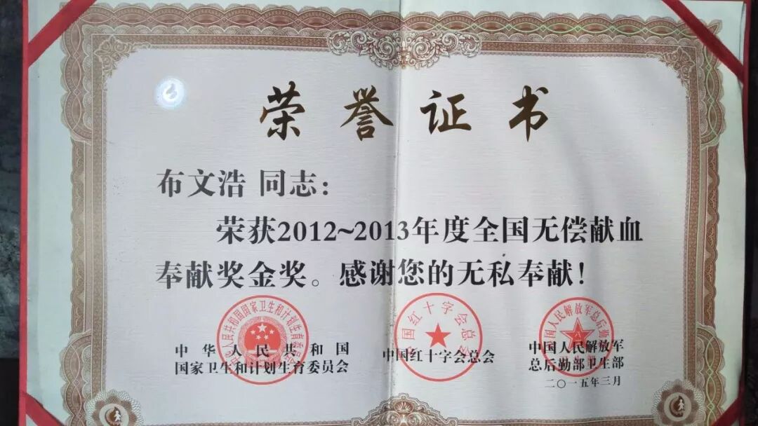 布文浩是新乡市牧野区人,生前从事安保工作,18岁开始参加无偿献血活动,共无偿捐献了全血2800ml、血小板40个治疗量,计1万余毫升,两次获得全国无偿献血奉献奖金奖。 2014年因脑部疾病住院,之后无法参加无偿献血。
