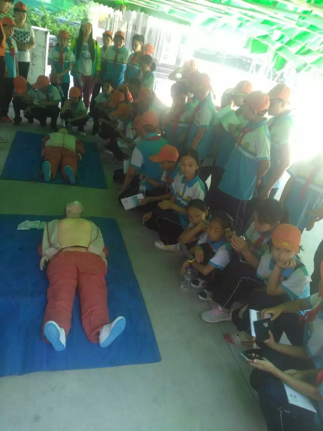 上午10时30分,全体师生在安排好住宿就餐等事宜,略微休息后,便安排两个班级的师生分批次参加了应急救护之心肺复苏等知识的学习。红十字志愿者首先结合小学高年级学生的实际讲解了理论知识,之后,由4名志愿者分别为师生进行了现场模拟操作演练,在观看操作后,学生们热情高涨,争先恐后地加入到操作当中,学习的兴趣和愿望十分强烈。14时左右,年级的另外三个班级在景区内的马武寨景点进行了应急救护之心肺复苏知识等的学习和操作练习,效果显著。