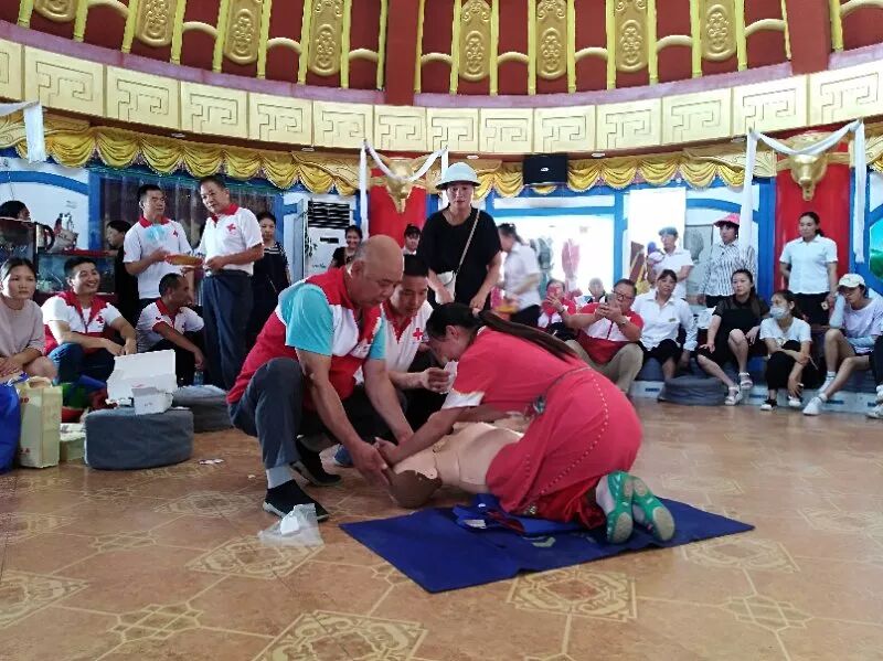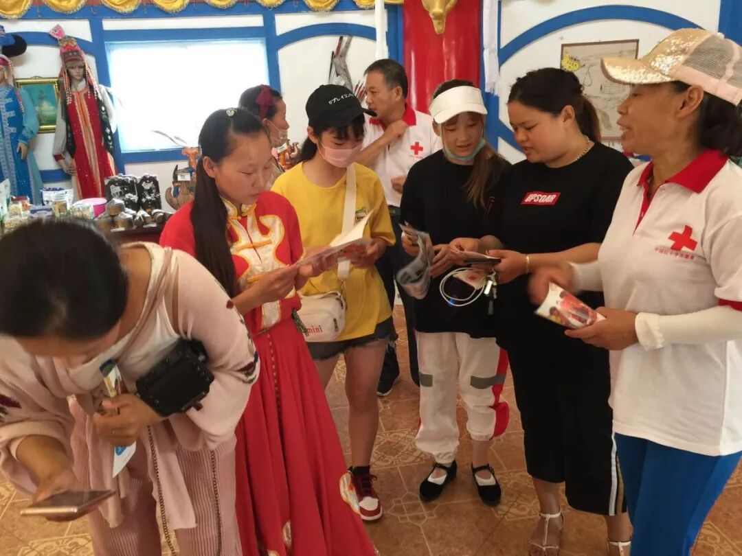 7月21日红十字三献志愿服务队走进***站:国家4***景区京华园开展活动。服务队结合景区的实际情况和需求,为景区近200名工作人员及游客讲授了拨打120求助应注意事项,遭遇中暑、溺水等突发意外情况的现场救护处理,着重讲解了心肺复苏术的内容和要点,并模拟演示现场救护,指导大家利用模拟人进行实操和训练。讲座结束后志愿者们走进景区分发“三献”知识宣传材料并详细为大家答疑解惑,活动效果良好,受到了景区及游客的一致好评。